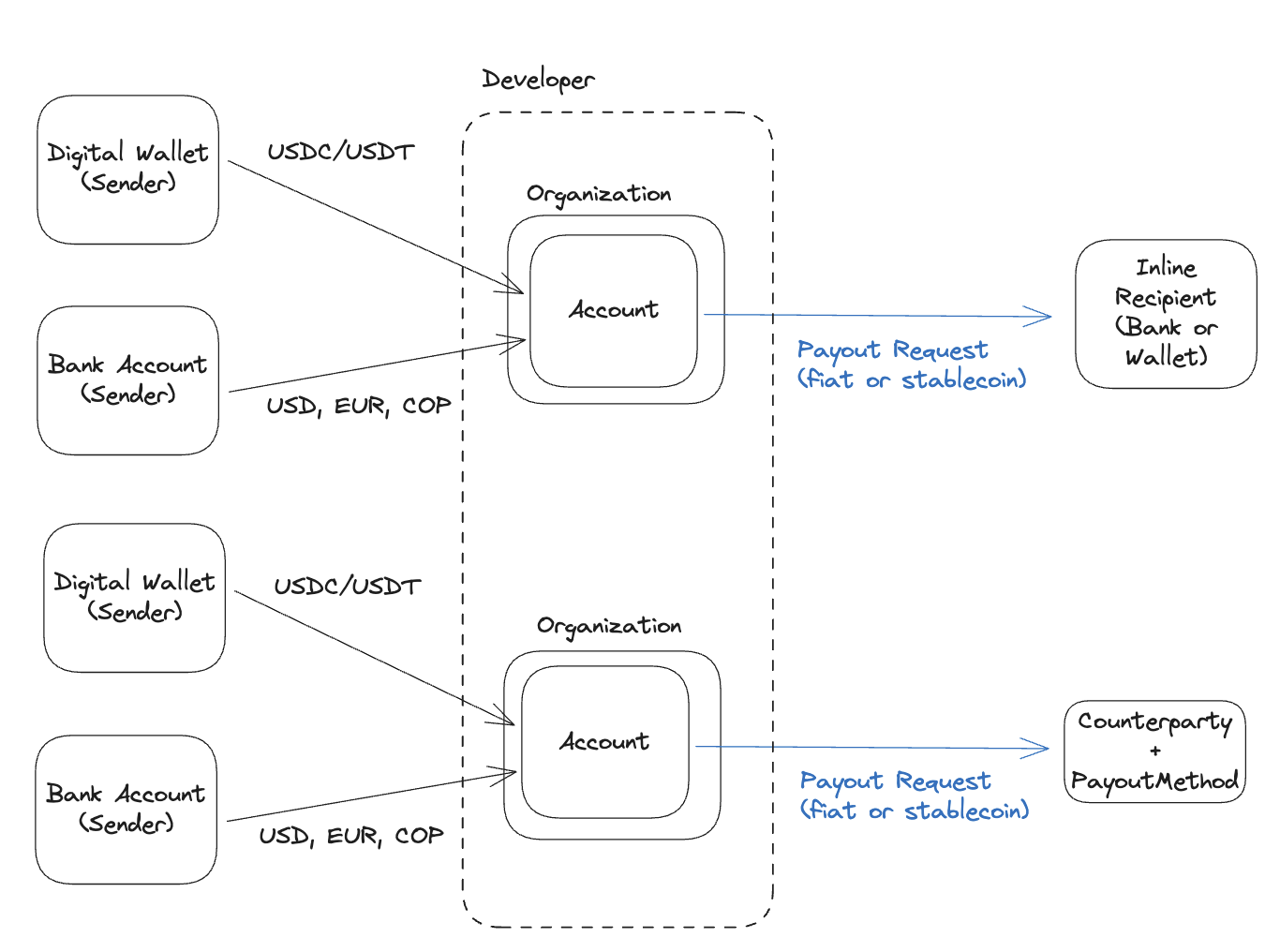 Inline payout recipient information can either be of type FIAT (e.g. EUR, MXN, USD, BRL, COP, etc.) to an external Bank Account, or of type BLOCKCHAIN (USDC / USDT) to a digital wallet. Please see the Fiat Rail Code documentation for more details on how to properly construct a fiat payout.